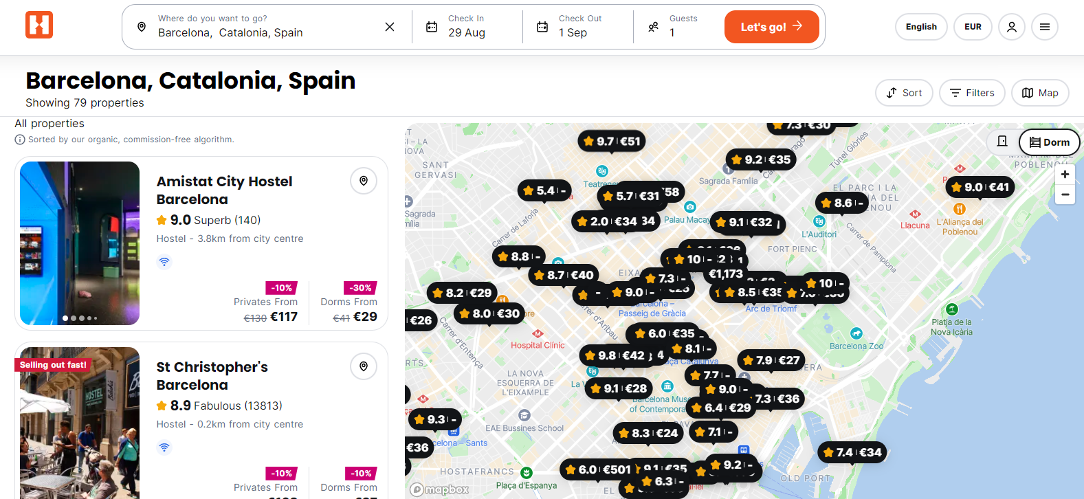 Shown above are snips from Hostelworld when I searched for a hostel in Barcelona, Spain. The main aspects I look at when picking a hostel are its rating, distance from the city center, price, and room sizes. For women, most hostels offer women-only dorms as an option. Most locations have numerous options to choose from. Large cities like Barcelona probably have hundreds of options. It’s because of this, that I like to only stay at Hostels that are 8 stars or higher. Yes, some of these higher-rated hostels might be more expensive, but in big cities, you have so many other options that you are bound to find other hostels that more like your price.